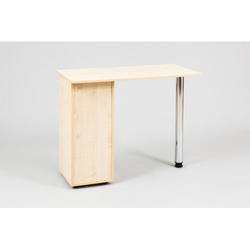 Стол обеспечен необходимым оснащением - закрывающаяся ниша с поперечной полкой, открытая полка, удлиненная столешница и опорная стойка. Каркас стола представлен ламинированным ДСП.